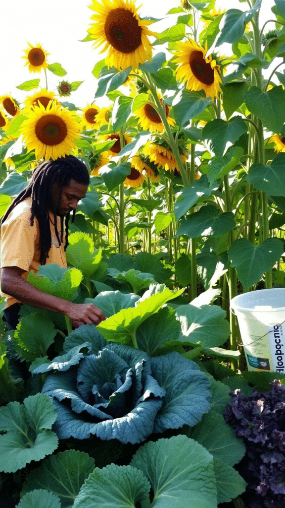 Plant sunflowers near kale. The sunflowers attract beneficial insects that help keep pests away from the kale. It’s a natural pest control method.