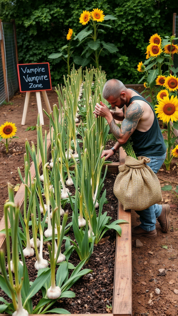 Let sunflowers grow near garlic. The sunflowers attract pollinators, helping your garlic produce more bulbs. It’s a productive partnership.