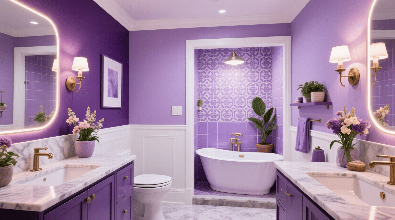 Combining purple with gold accents exudes elegance. Think gold-framed mirrors or faucets. It’s royal, literally.