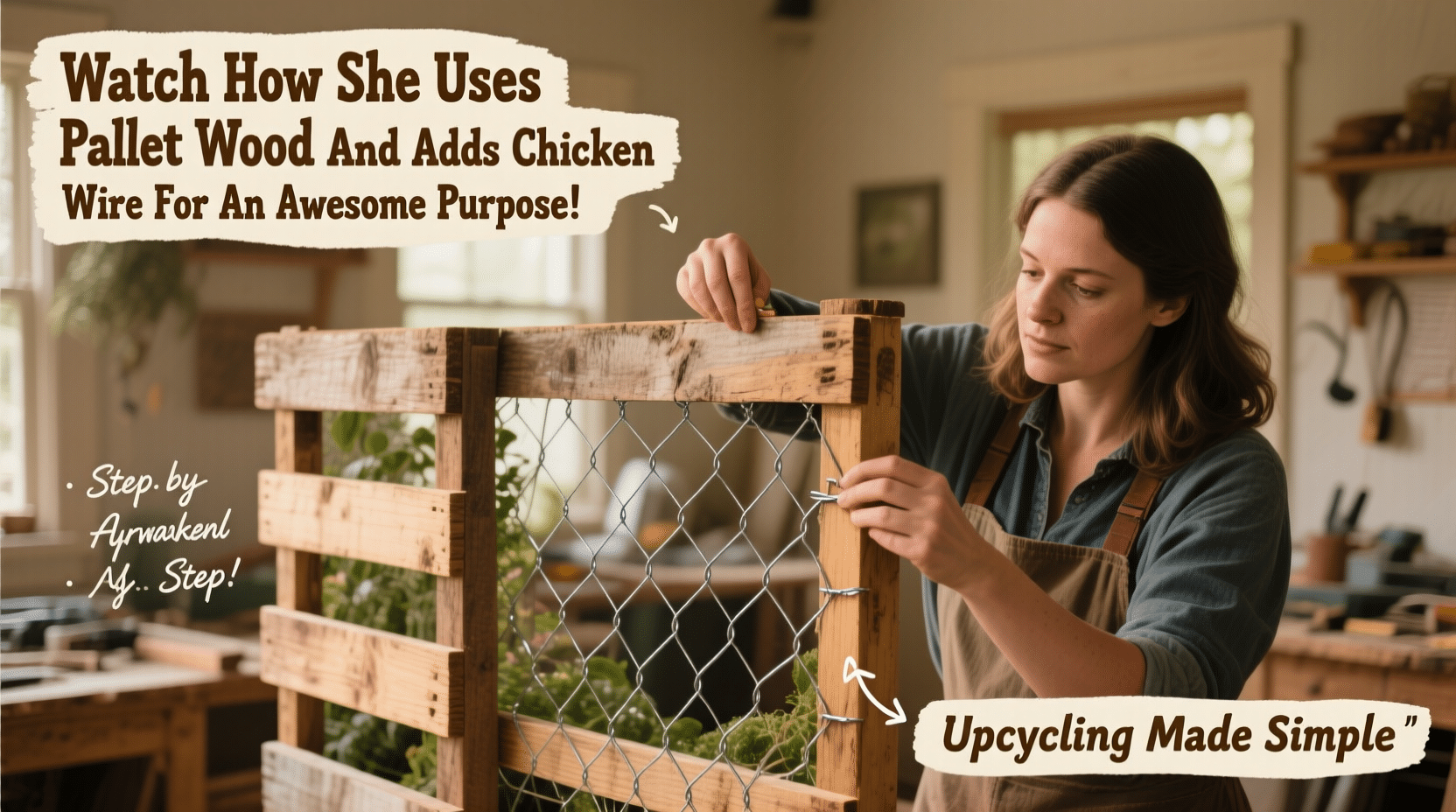 That’s exactly what she’s doing here with pallet wood and chicken wire.